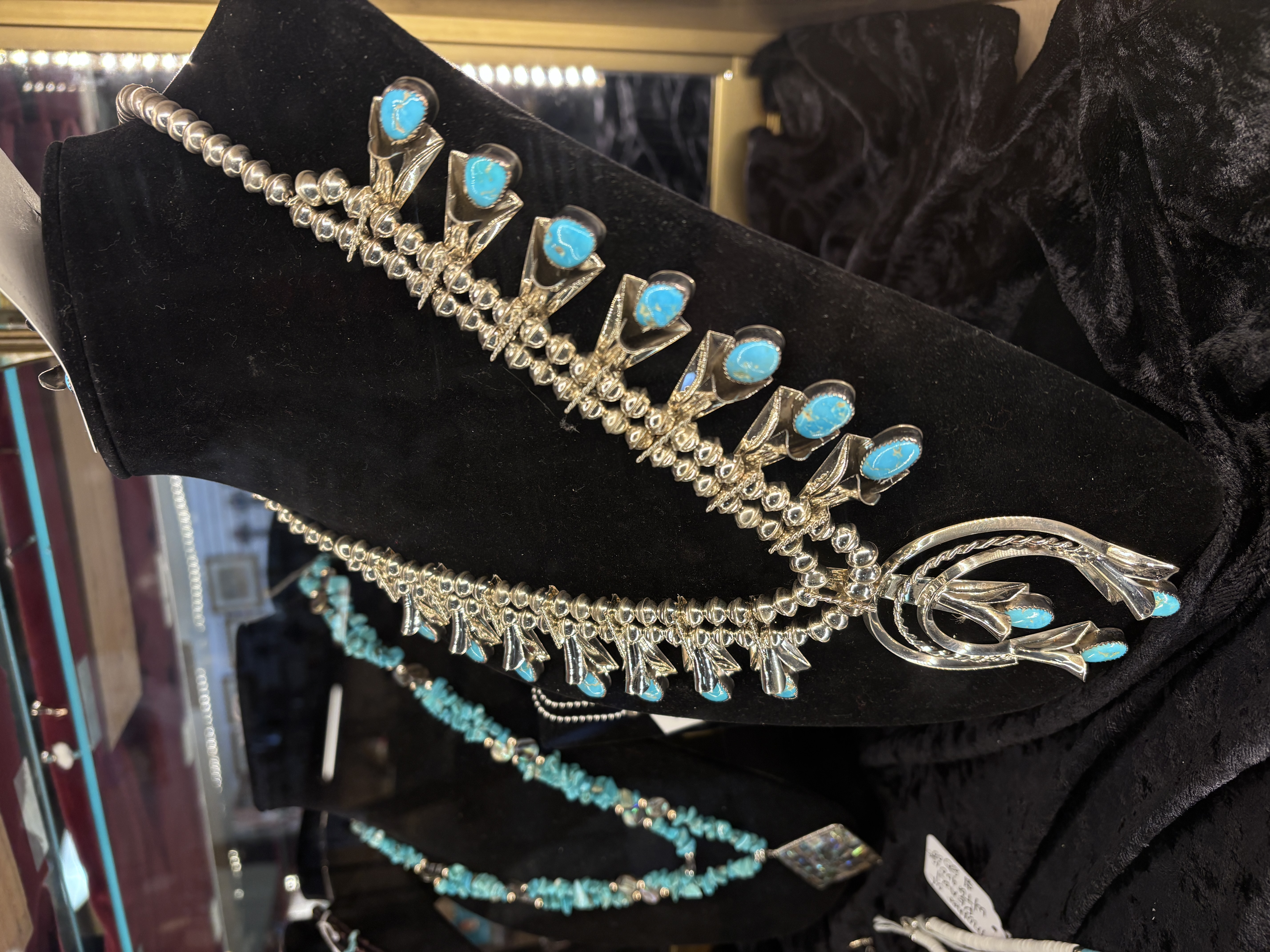 - Ornate silver squash blossom necklace with turquoise stones on black display.