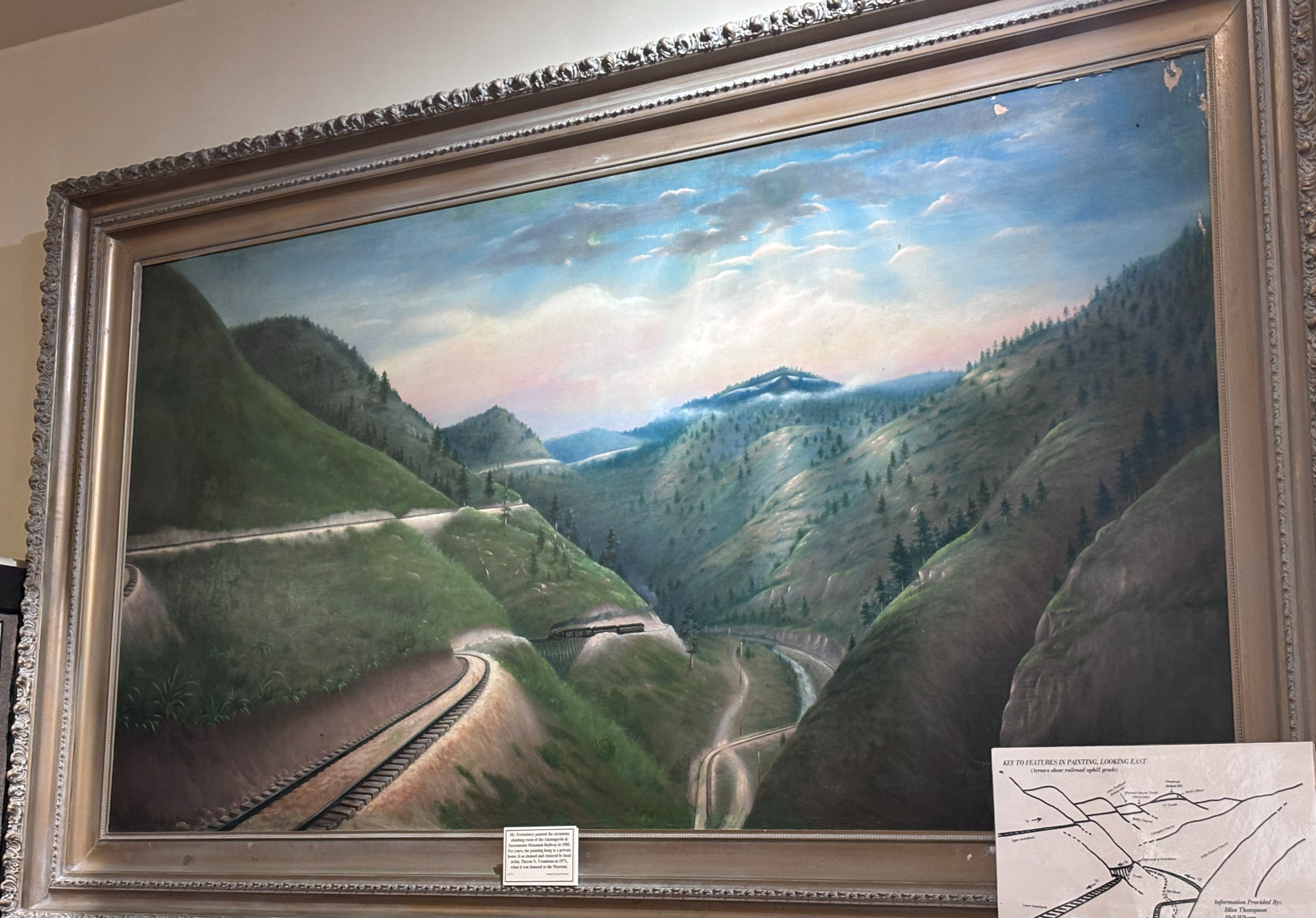 - Ornate framed painting of a valley with winding railroad tracks and river.